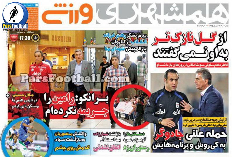 مروری داریم بر عناوین روزنامه همشهری ورزشی چهارشنبه ۳۱ شهریور ۹۵ | از گل نازک تر به او نمی گفتند | برانکو: رامین را جریمه نکرده ام.