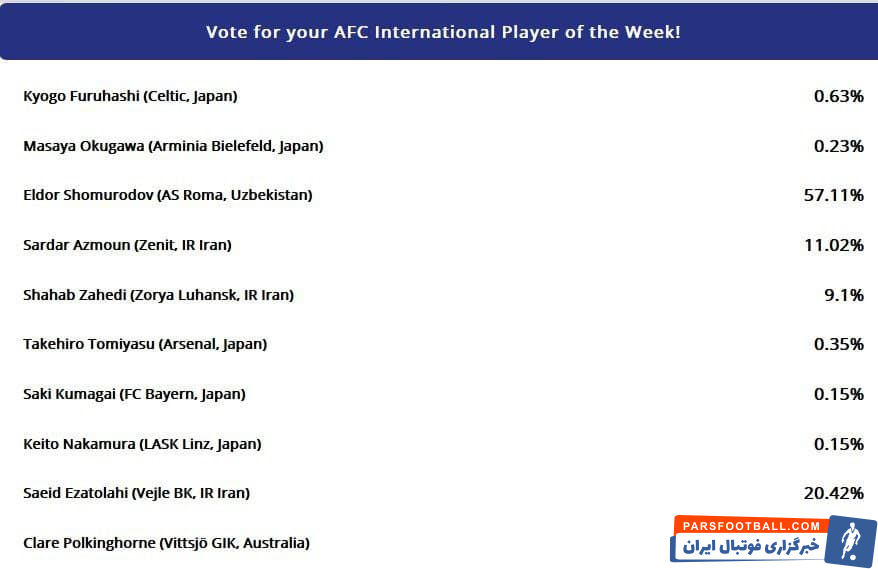 سایت کنفدراسیون فوتبال آسیا یک نظرسنجی برای انتخاب بهترین لژیونر هفته قاره کهن برگزار کرده بود که امروز به پایان رسید.