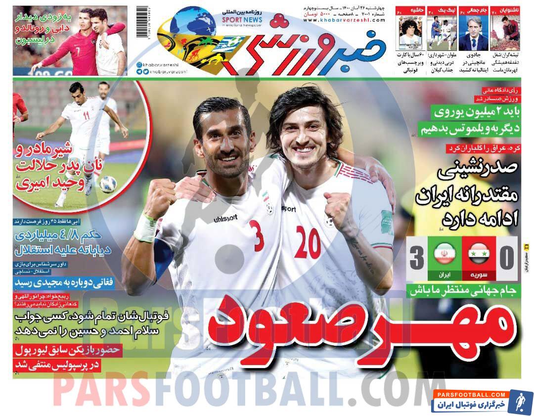 عناوین روزنامه خبر ورزشی چهارشنبه ۲۶ آبان ماه به شرح زیر است :