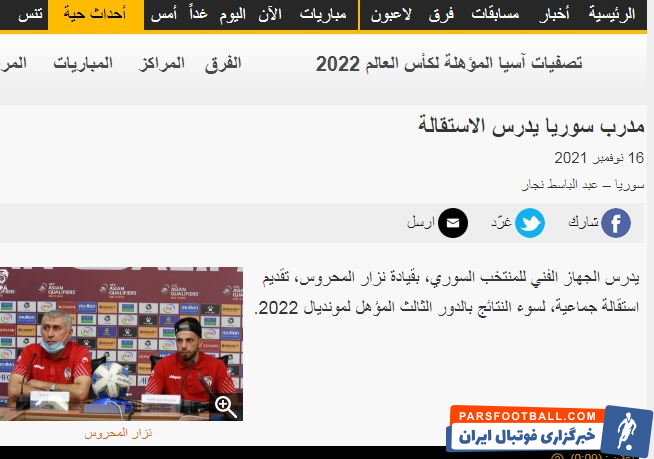 سایت الکوره خبر داد کادر فنی تیم ملی فوتبال سوریه و در راس آنها نزار محروس بعد از باخت مقابل ایران با نتیجه ۳ بر صفر به فکر استعفای جمعی است.