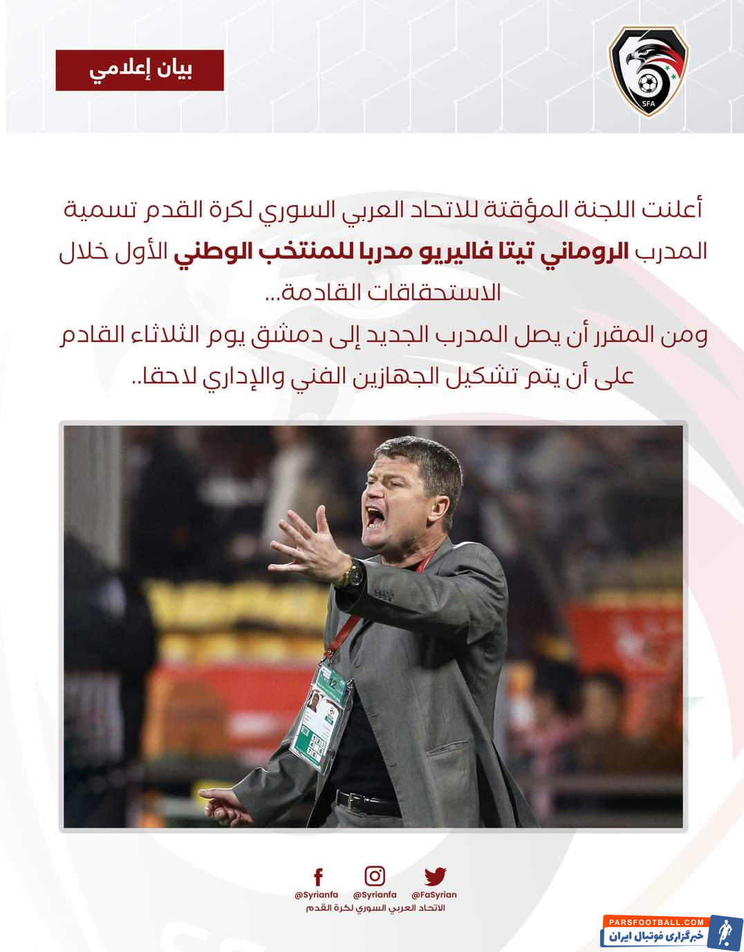 فدراسیون فوتبال این کشور لحظاتی پیش با انتشار بیانیه ای مربی جدید عقاب ها را معرفی کرد. بدین ترتیب تیته والریو مربی رومانیایی هدایت تیم ملی سوریه را برای ادامه مسابقات انتخابی جام جهانی ۲۰۲۲ برعهده گرفت. این مربی اروپایی سه شنبه آینده به دمشق می رسد.