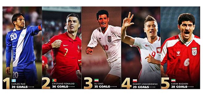 بعد از رونالدو، علی دایی را در جدول یاد شده می بینیم؛ مهاجم اسبق تیم ملی فوتبال ایران با ۳۵ گل زده سومین نفر برتر این رده بندی و بهترین گلزن تاریخ مقدماتی جام جهانی در قاره آسیا به حساب آید. بعد از دایی لواندوفسکی، مهاجم آماده این روزهای لهستان و بایرن مونیخ را می بینیم که او هم مثل رونالدو با توجه به حضور تیمش در پلی آف، شانس بالاتر بردن تعداد گل های خود را دارد.