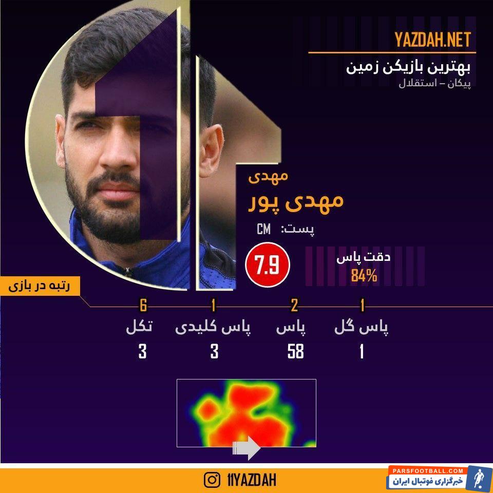 مهدی مهدی پور که با ارسال های دقیق و نتیجه بخش خود نقش پر رنگی در پیروزی پرگل و شیرین استقلال مقابل پیکان داشت، از دیدگاه وب سایت آماری یازده با نمره ۷.۹ بهترین بازیکن زمین شد.