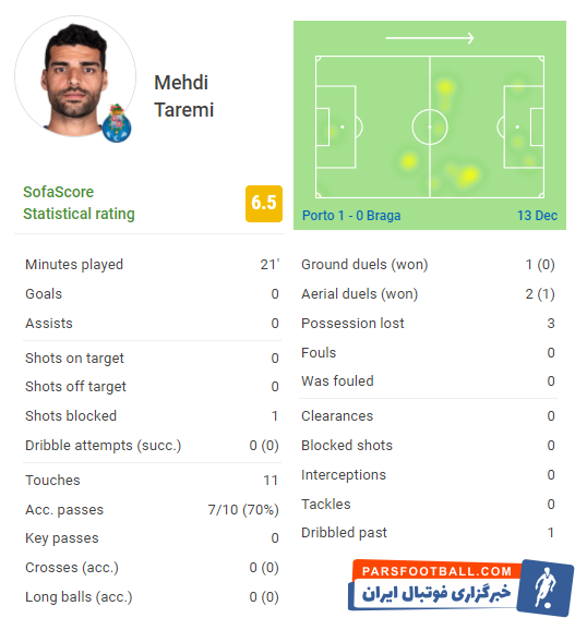 ستاره کشورمان در این مسابقه یک شوت به سمت دروازه زد که آن شوت نیز به مدافعان برخورد کرد و راهی دروازه نشد. او ۱۱ بار توپ را لمس کرد و در مجموع ۱۰ پاس داد که ۷ پاس به درستی به بازیکنان پورتو رسید. طارمی در نبرد زمینی ناموفق ظاهر شد و یک بار که خواست بازیکن را از پیش رو بردارد، نتوانست این کار را نهایی کند. او البته در زمینه هوایی یک بار به درستی توپ را تصاحب کرد تا در این زمینه دوباره عملکرد خوبی به ثبت رساند.