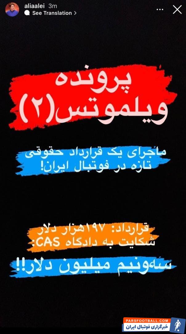 حالا و در شرایطی که هنوز رای نهایی در رابطه با پرونده ویلموتس صادر نشده، علی عالی دستیار عزیزی خادم با انتشار یک استوری از ظهور یک پرونده دیگر خبر داده است؛ پروندهای که طبق گفته دستیار عزیزی خادم قراردادی ۱۷۵ هزار دلاری بوده که در شکایت به دادگاه عالی ورزش (CAS) به سه و نیم میلیون دلار افزایش پیدا کرده است.