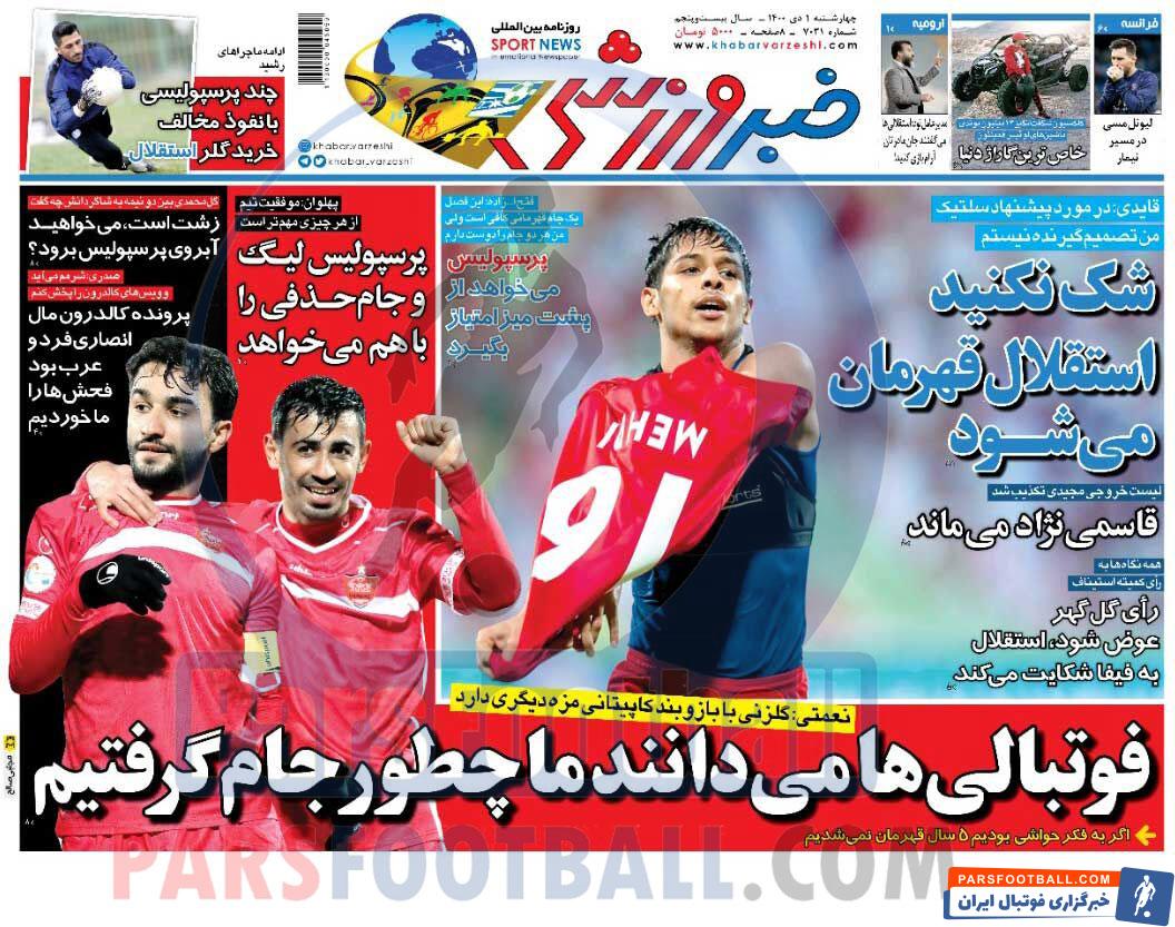 عناوین روزنامه خبر ورزشی چهارشنبه ۱ دی ماه به شرح زیر است :