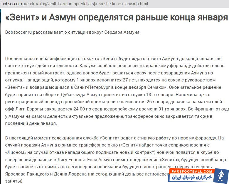 به گزارش پارس فوتبال و به نقل از فارس، سایت «bobsoccer» روسیه خبر داد اخباری که از سردار آزمون و باشگاه زنیت منتشر شد درست نیست و این بازیکن تا پایان ژانویه پاسخ زنیت را برای تمدید قرارداد را نمی دهد.