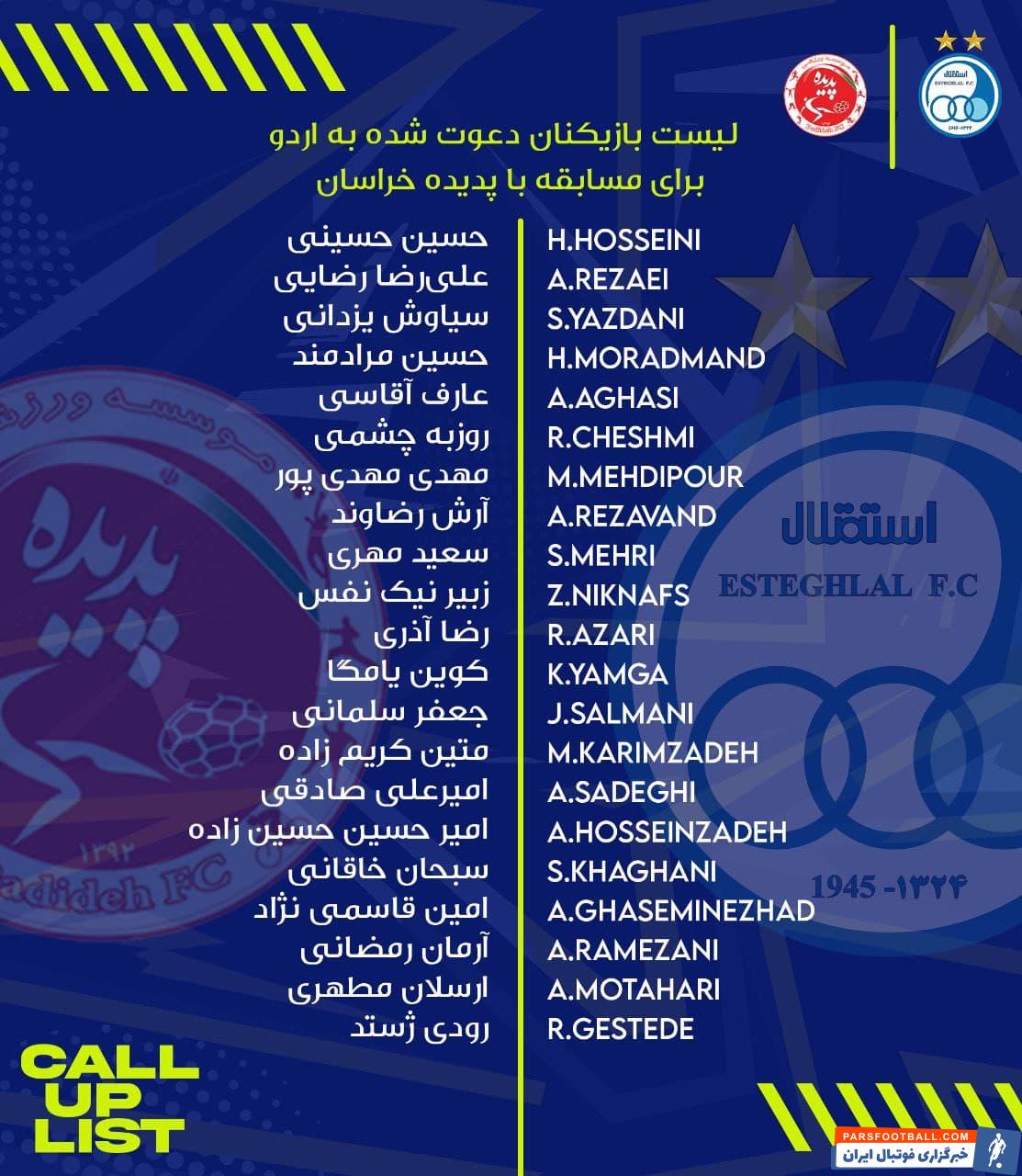 فهرست بازیکنان استقلال برای دیدار با پدیده در هفته یازدهم لیگ برتر اعلام شد و رشید مظاهری، بابک مرادی، محمدرضا آزادی، وریا غفوری و محمد دانشگر از این فهرست خط خوردند.
