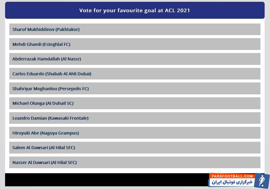 در نظرسنجی AFC در انتخاب بهترین گل فصل گذشته لیگ قهرمانان آسیا گل های مهدی قایدی و شهریار مغانلو نیز نامزد شده اند.