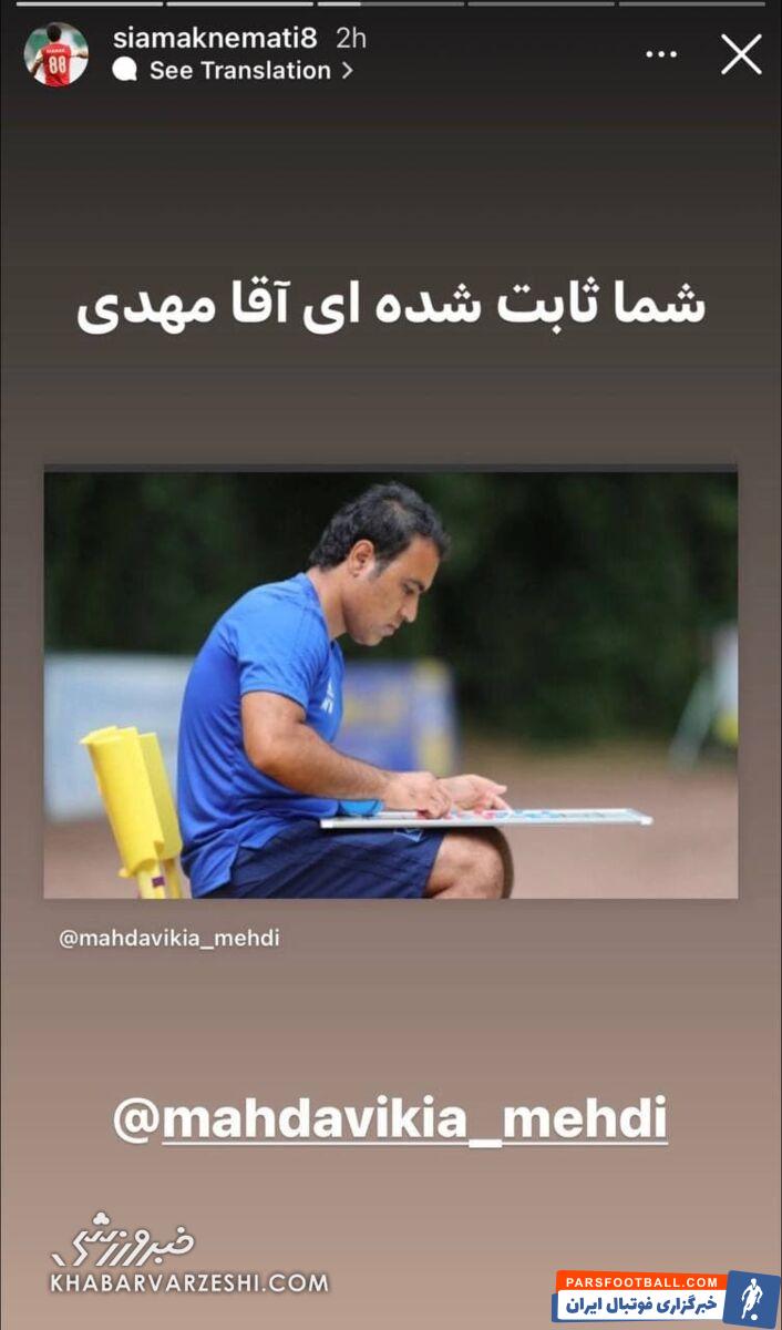 سیامک نعمتی بازیکن تیم فوتبال پرسپولیس که به تازگی به جمع کاپیتانهای سرخپوشان پایتخت پیوسته است، با انتشار یک استوری حمایت خود از مهدی مهدوی کیا اسطوره فوتبال ایران، را نشان داد.