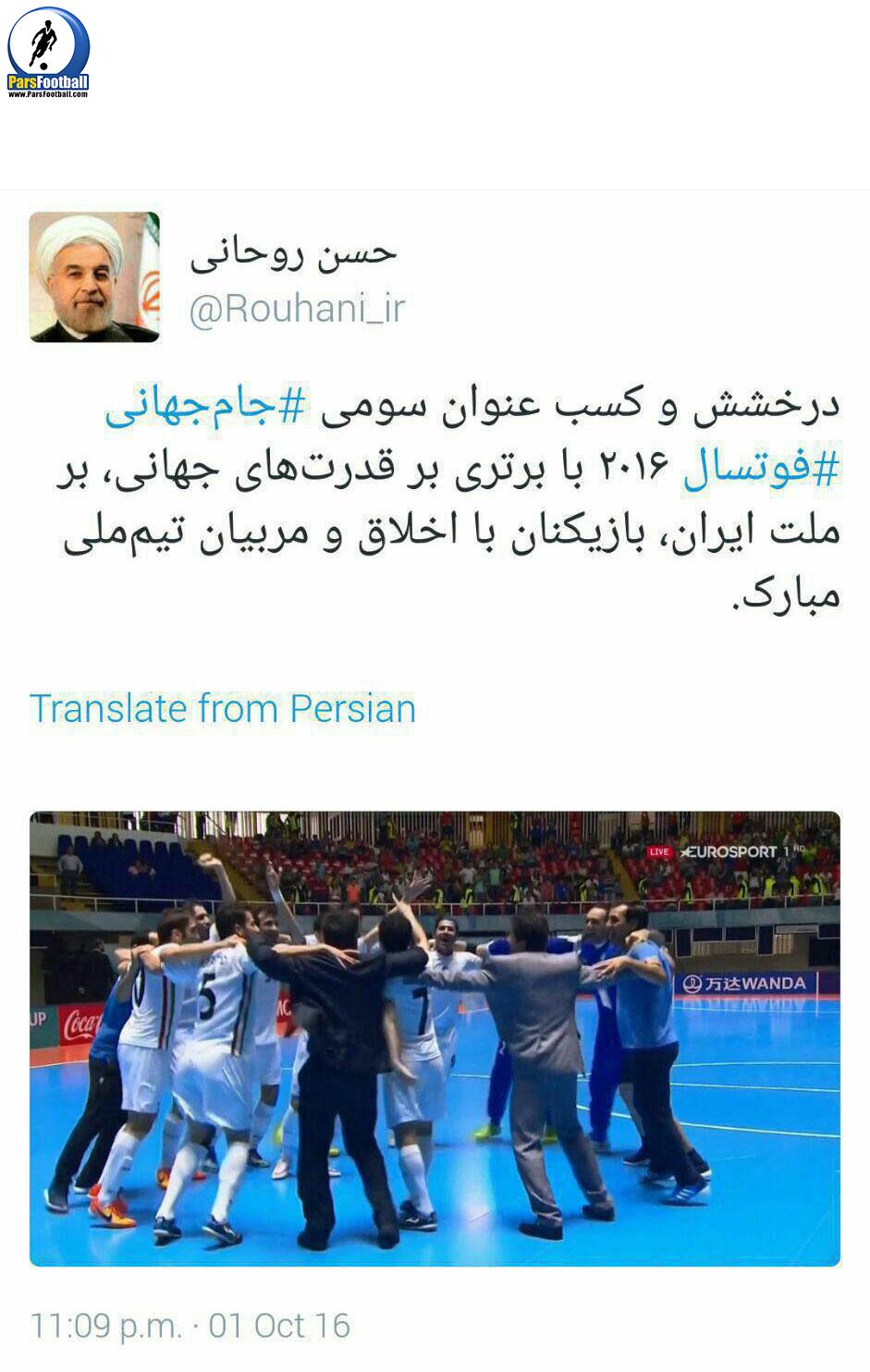 حجت‌الاسلام حسن روحانی در صفحه توئی‌تر خود نوشت:درخشش و کسب عنوان سومی جام جهانی فوتسال ۲۰۱۶ با برتری بر قدرت‌های جهانی، بر ملت ایران، بازیکنان با اخلاق و مربیان تیم ملی مبارک.