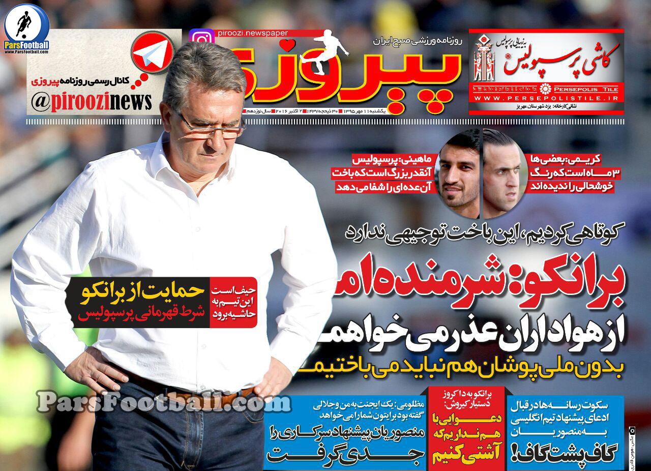 روزنامه پیروزی یکشنبه ۱۱ مهر ۹۵ | برانکو : شرمنده ام ، از هواداران عذر می خواهم ، بدون ملی پوشان هم نباید می باختیم