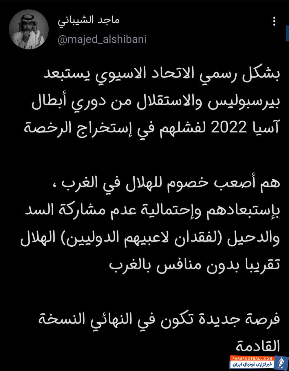 کنفدراسیون فوتبال آسیا رسماً پرسپولیس و استقلال را به دلیل عدم کسب مجوز حرفهای، از لیگ قهرمانان آسیا در سال ۲۰۲۲ محروم کرد. آنها سرسخت ترین حریفان الهلال در غرب آسیا هستند. علاوه بر این دو تیم، احتمال عدم حضور کامل السد و الدحیل (به دلیل در اختیار نداشتن بازیکنان ملی پوش خود)، باعث شده است تا الهلال تقریباً در غرب آسیا بدون رقیب باشد.