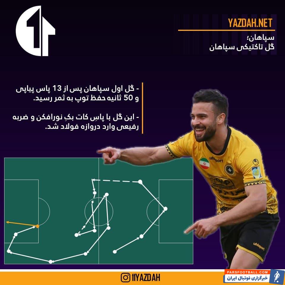 همانطور که در تصویر مشخص است، سپاهانیها برای ثبت این گل از قسمتهای مختلف زمین به استثنای منطقه راست هجومی تیمشان بهره گرفتهاند.