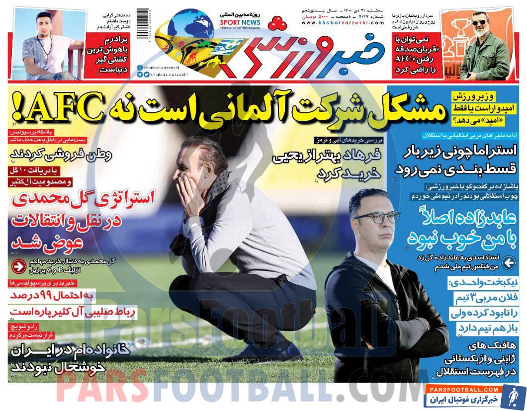 عناوین روزنامه خبر ورزشی سه شنبه ۲۱ دی ماه به شرح زیر است :