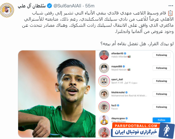 واکنش رسانه های اماراتی به دنبال کردن مکگری گزینه مدنظر سلتیک اسکاتلند توسط مهدی قایدی در اینستاگرام و شایعه جدایی او از شباب الاهلی