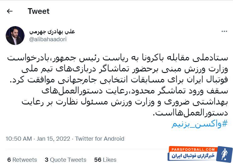 علیرضا بهادری جهرمی اعلام کرد ستاد ملی مقابله با کرونا به ریاست رئیس جمهور با درخواست وزارت ورزش مبنی بر حضور تماشاگر در بازیهای تیم ملی فوتبال ایران برای مسابقات انتخابی جام جهانی موافقت کرد. سقف ورود تماشاگر محدود و رعایت دستورالعلهای بهداشتی ضروری است و وزارت ورزش مسئول نظارت بر رعایت دستورالعملها است.