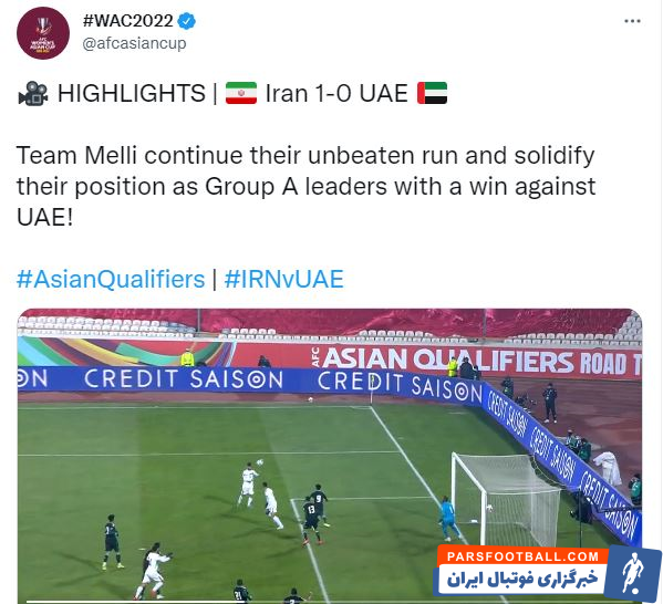 توئیتر رسمی کنفدراسیون فوتبال آسیا با انتشار خلاصه بازی تیم ملی ایران با امارات به تمجید از شاگردان اسکوچیچ پرداخت.