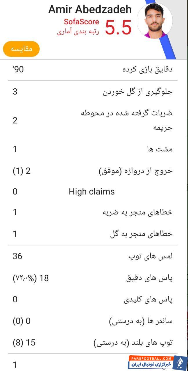 با نگاه به آمار عابدزاده این دروازه بان ملی پوش ایرانی ۳ گل این این بازی دریافت کرد. تنها ۳ سیو موفق داشته است. همچنین ۷۲ درصد پاس های بلندش به مقصد رسیده است.
