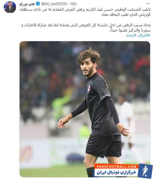 خبرنگار عراقی دلیل رد کردن پیشنهاد سپاهان از سوی حسن عبدالکریم هافبک تیم ملی این کشور را اعلام کرد.