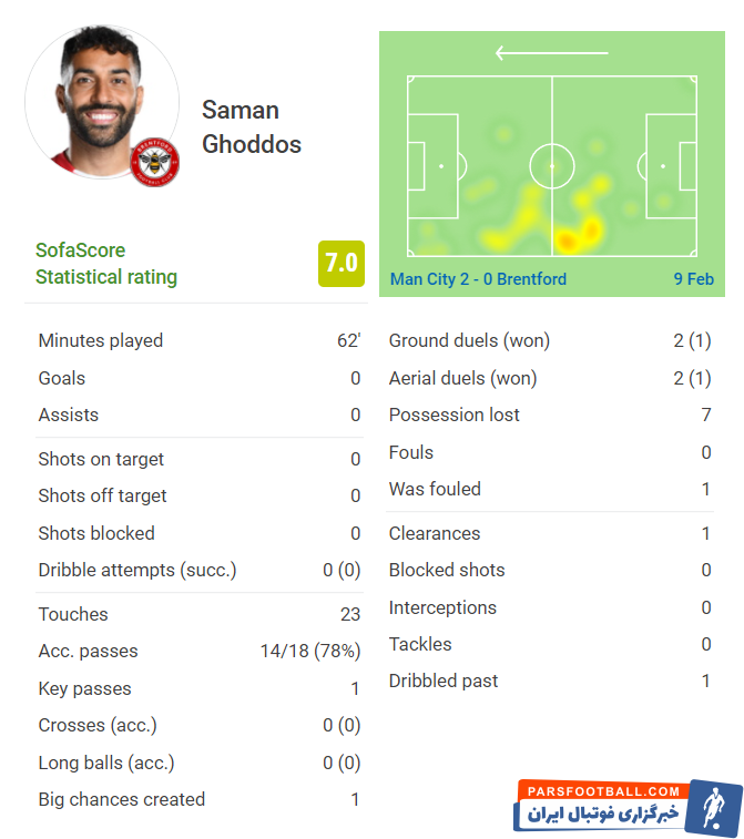 سامان قدوس مهاجم ملی پوش تیم برنتفورد انگلیس در دیدار با منچسترسیتی با عملکرد نسبتاً خوبی که از خودش بجای گذاشت لقب بهترین بازیکن برنتفورد را از آن خودش کرد.