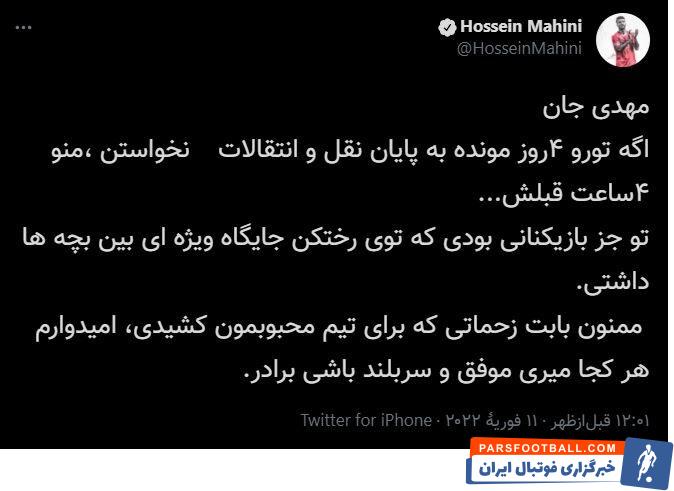 حسین ماهینی، بازیکن پیشین پرسپولیس با انتشار یک توییت به حمایت از مهدی شیری پرداخت. ماهینی البته در این توییت اشاره ای هم به کنار گذاشتن خودش توسط یحیی گل محمدی در بدو ورودش به پرسپولیس داشت.