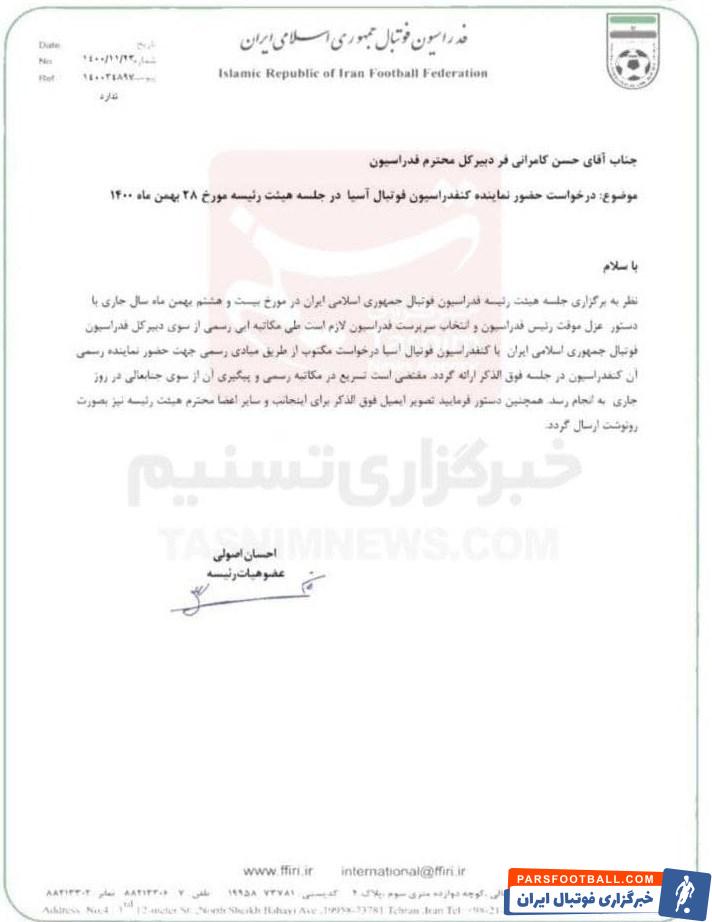احسان اصولی، یکی از اعضای هیئت رئیسه در نامهای به حسن کامرانیفر، دبیرکل فدراسیون فوتبال خواستار حضور نماینده AFC در جلسه پیشروی هیئت رئیسه شده است.