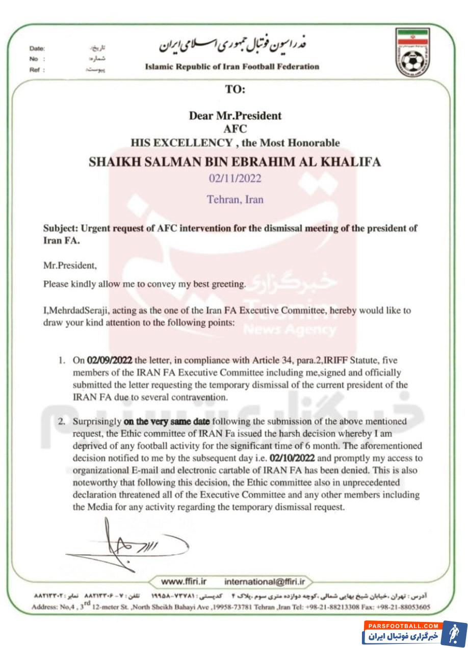 در شرایطی که جامعه فوتبال منتظر برگزاری جلسه هیئت رئیسه فدراسیون فوتبال در روز پنجشنبه، ۲۸ بهمنماه با دستور جلسه عزل رئیس فدراسیون و انتخاب سرپرست است، دو نامه نگاری مهم از سوی اعضای هیئت رئیسه صورت گرفت.