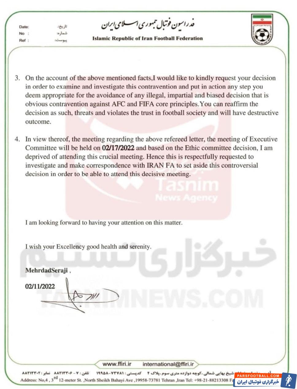 همچنین مهرداد سراجی دیگر عضو هیئت رئیسه و از مخالفان شهابالدین عزیزی خادم که اخیراً با محرومیتی شش ماهه از سوی کمیته اخلاق مواجه شده، در نامهای خطاب به شیخ سلمان، رئیس کنفدراسیون فوتبال آسیا خواستار رسیدگی به این موضوع شده و این سؤال را مطرح کرده که آیا این کار قانونی است یا خیر. مدیرعامل سایپا از شیخ سلمان خواسته به فدراسیون ایران اعلام کند که این رأی لغو شود تا او بتواند در جلسه هیئت رئیسه شرکت کند.