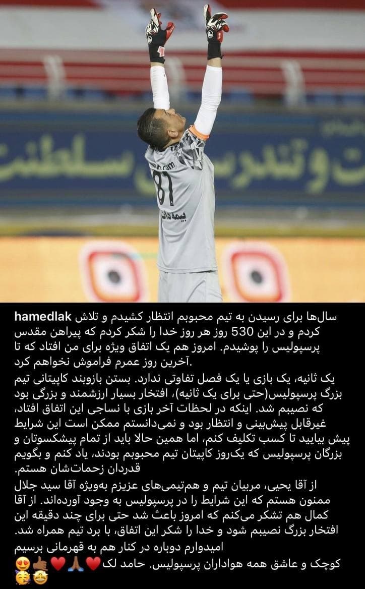 حامد لک پس از بستن بازوبند کاپیتانی پرسپولیس در بازی با نساجی مازندران با انتشار پیامی احساسی در اینستاگرام نوشت این اتفاق را تا آخر عمر فراموش نخواهد کرد.