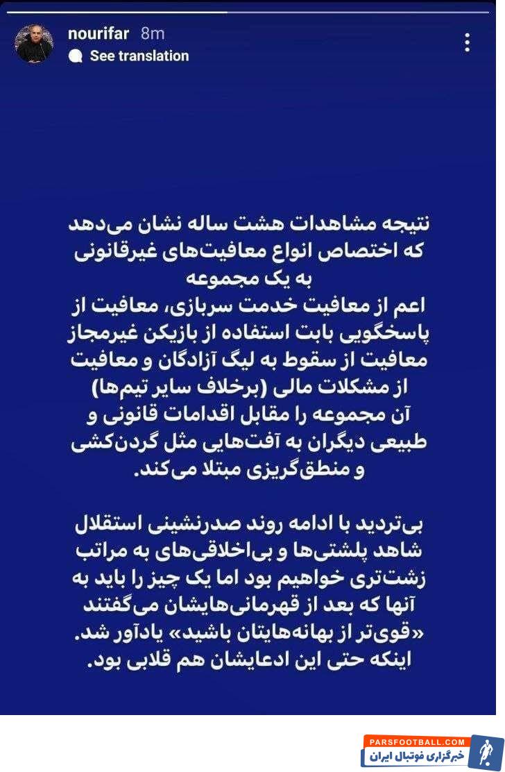 محمد نوری فر در این خصوص استوری زیر را در صفحه شخصی خود در اینستاگرام منتشر کرد و بدون اینکه نامی از باشگاه پرسپولیس ببرد اظهارات بسیار تندی را خطاب به این باشگاه مطرح کرد. نوری فر سرخ ها را متهم به گردن کشی در برابر قانون کرده است و البته کنایه تندی به حمید مطهری مربی پرسپولیس زده است. مطهری پیش از این در یکی از ماحبه هایش خطاب به رقیب گفته بود سعی کنید از بهانه هایتان قوی تر باشید.