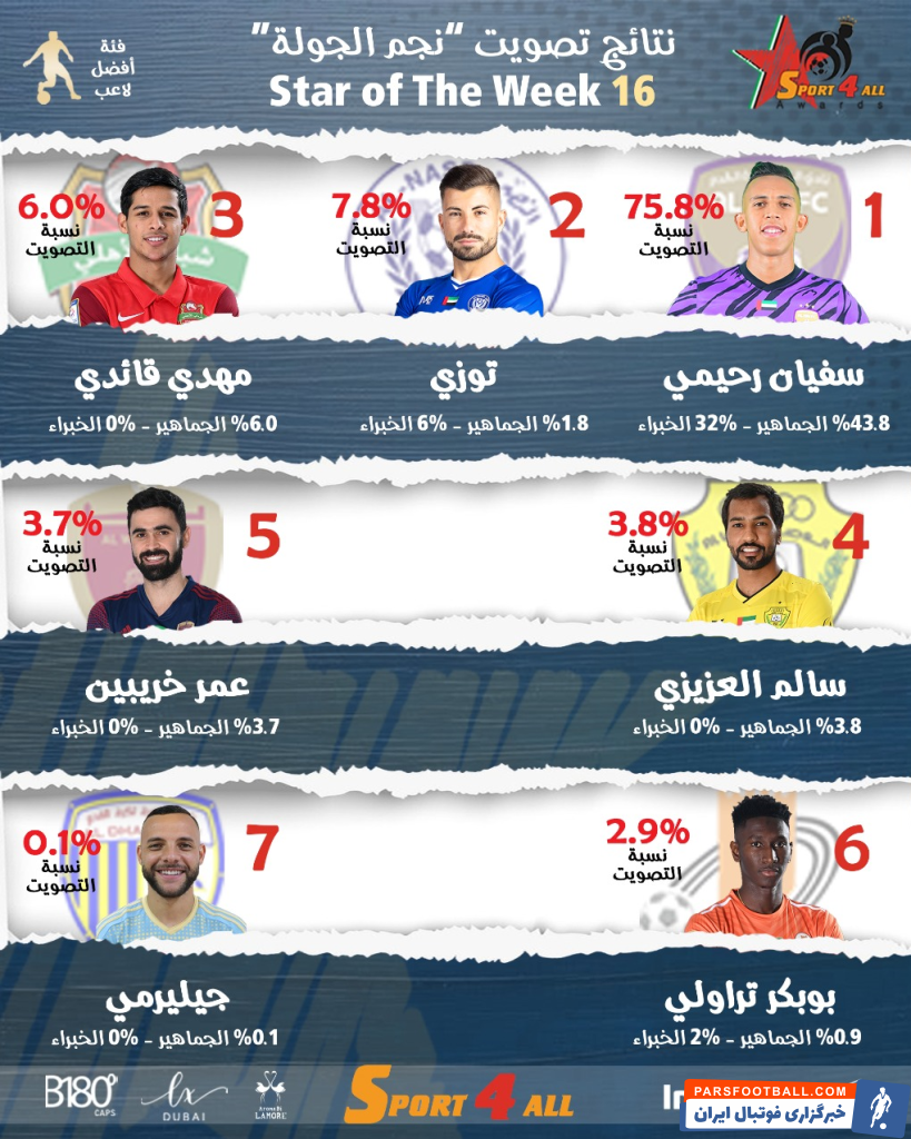 سازمان لیگ برتر امارات با اتمام هفته شانزدهم رقابت های این لیگ به معرفی بهترین بازیکنان هفته پرداخت.