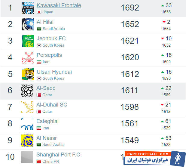 پرسپولیس با امتیاز ۱۶۲۰ همچنان در جایگاه چهارم آسیا ایستاده است.