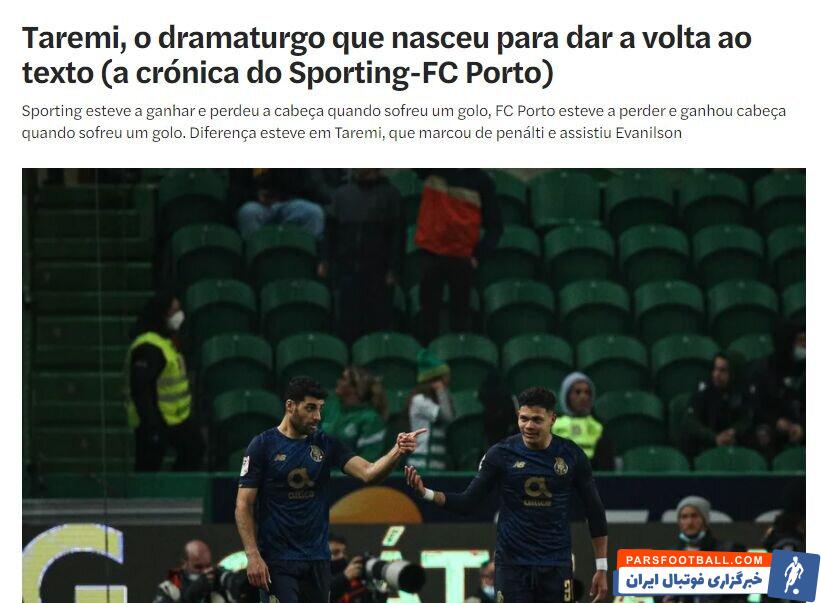 در بخشی از مطلب این رسانه پرتغالی آمده است: «بازیکن ایرانی که از تکرار پاسهای درخشان خسته نمیشود (آن پاس گل در بازی با لاتزیو را یادتان هست؟) همانطور که دیدیم در این مسابقه هم با یک حرکت پاشنه به عقب این کار را انجام داد، انگار ۳۰ چشم در سر دارد.»