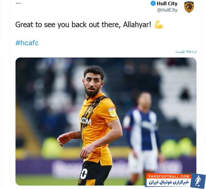 پس از اینکه اللهیار صیادمنش از بند مصدومیت رهایی یافت و برای دقایقی در ترکیب هال سیتی در چمپیونشیپ به میدان رفت، باشگاه انگلیسی در توئیتر از این اتفاق ابراز خوشحالی کرد.