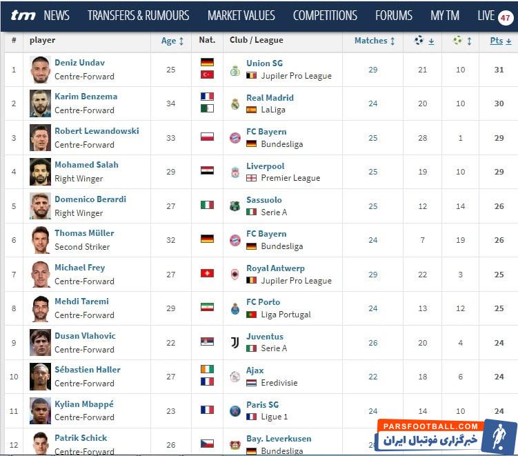 در میان ۱۵ لیگ معتبر اروپایی، در حال حاضر دنیز آنداو بازیکن تیم یونیون برلین با ۳۱ گل و پاس گل در صدر قرار دارد. پس از او کریم بنزما با تأثیرگذاری روی ۳۰ گل رئال مادرید در رتبه دوم قرار دارد و روبرت لواندوفسکی و محمد صلاح با ۲۹ گل و پاس گل، در رتبه سوم مشترک قرار دارند. دومنیکو براردی، توماس مولر و مایکل فری دیگر بازیکنانی هستند که بالاتر از مهدی طارمی قرار دارند.