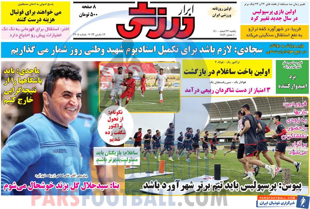 عناوین روزنامه ابرار ورزشی یکشنبه ۲۲ اسفند ماه به شرح زیر است :
