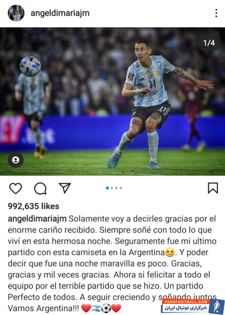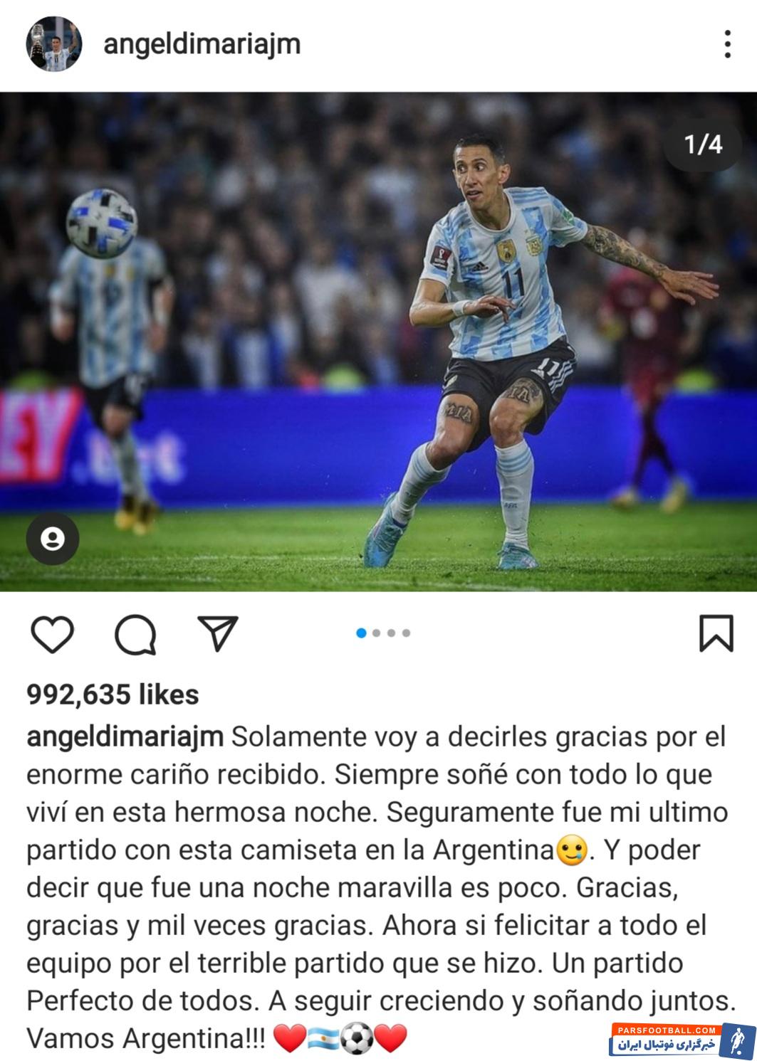 آنخل دی ماریا ، ستاره تیم ملی آرژانتین ، تایید کرد جام جهانی قطر آخرین تورنمنتی خواهد بود که او با لباس کشورش به میدان می رود.