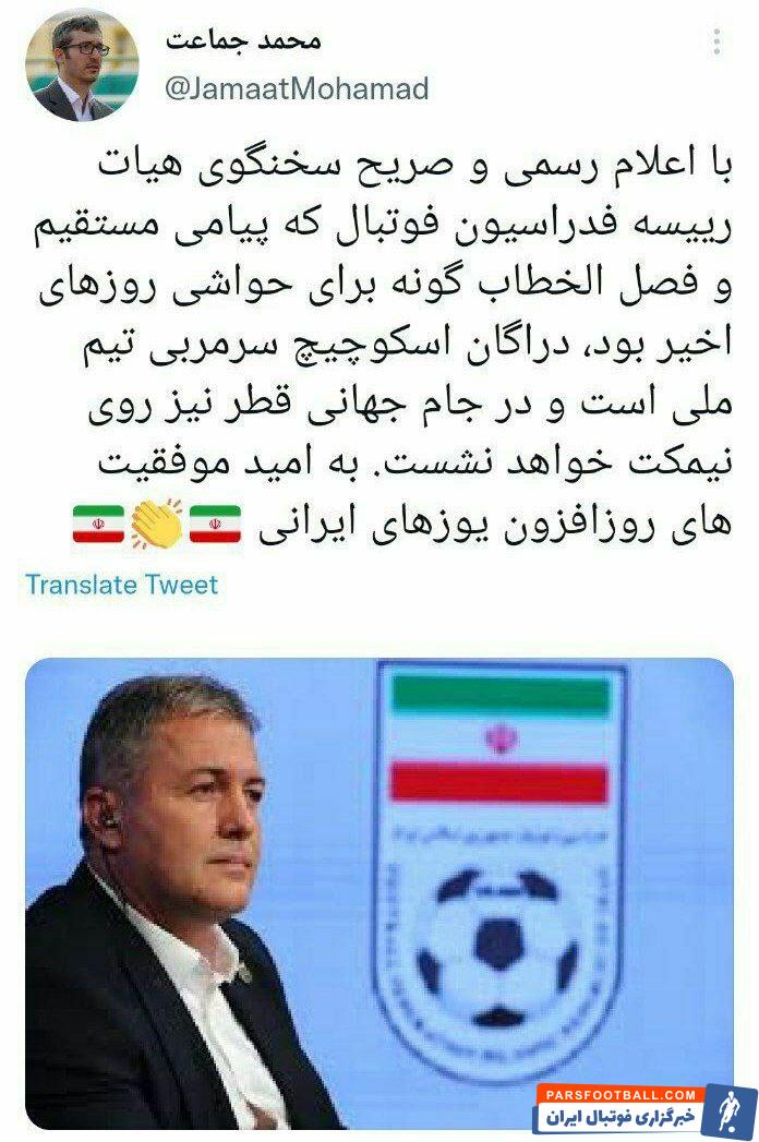 با اعلام رسمی و صریح سخنگوی هیئت رئیسه فدراسیون فوتبال که پیامی مستقیم و فصل‌الخطاب گونه برای حواشی روزهای اخیر بود ، دراگان اسکوچیچ سرمربی تیم ملی است و در جام جهانی قطر نیز روی نیمکت خواهد نشست .