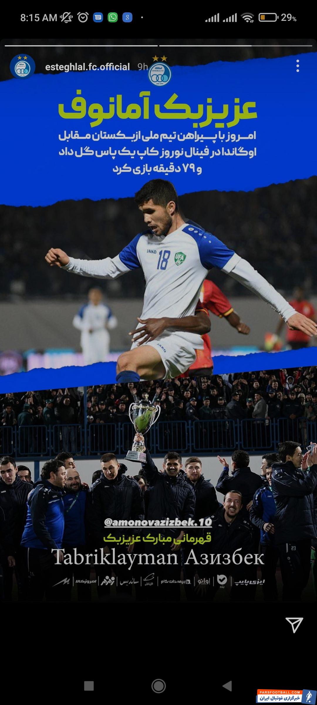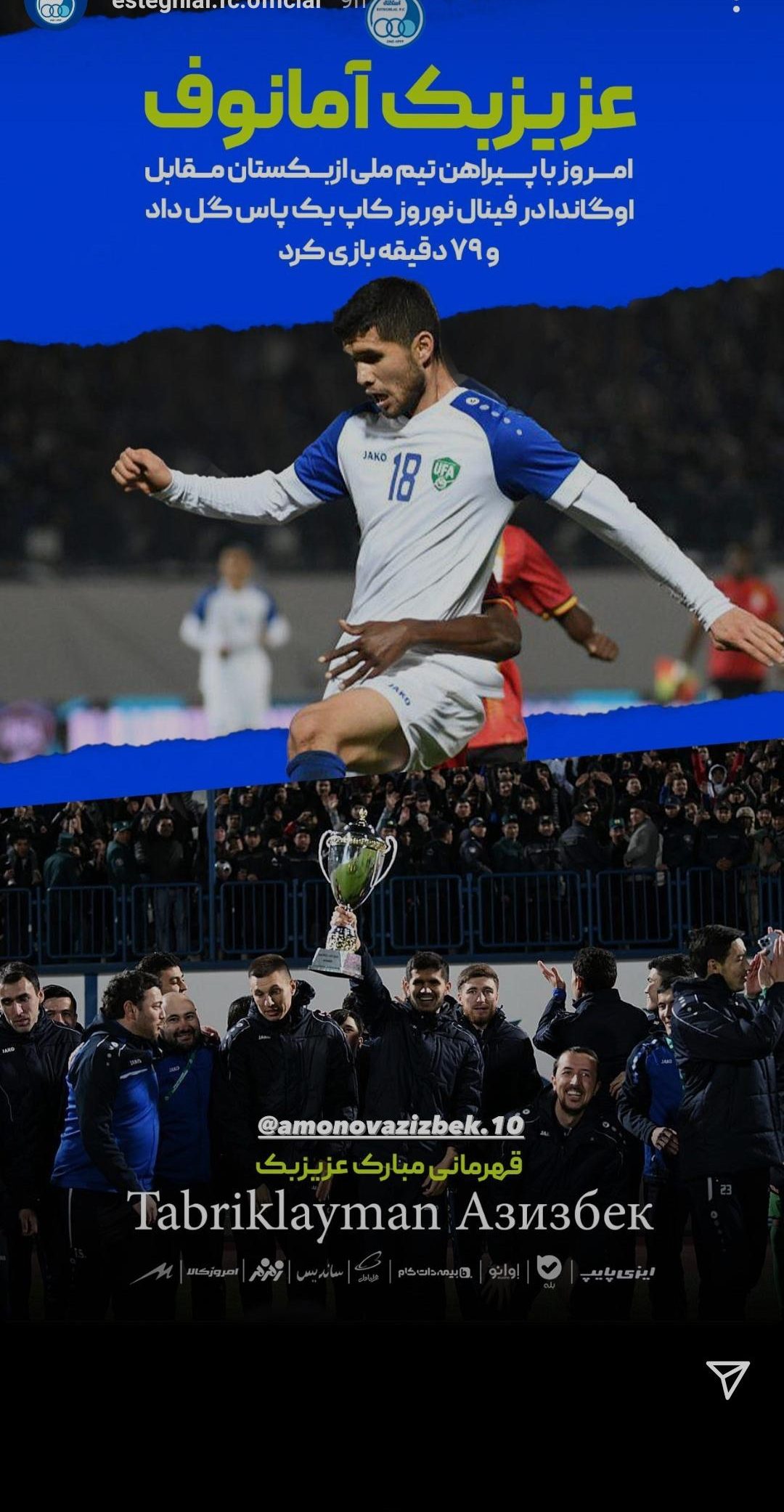 استوری تبریک باشگاه استقلال برای عزیزبک آمانوف بابت قهرمانی ازبکستان در نوروز کاپ