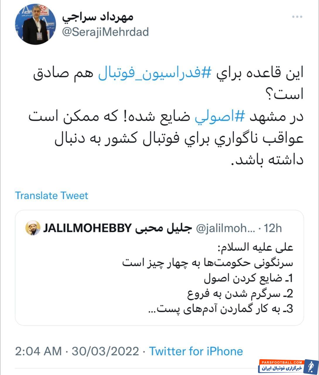 مهرداد سراجی توییت جدیدی را علیه سخنگوی فدراسیون فوتبال منتشر کرد.