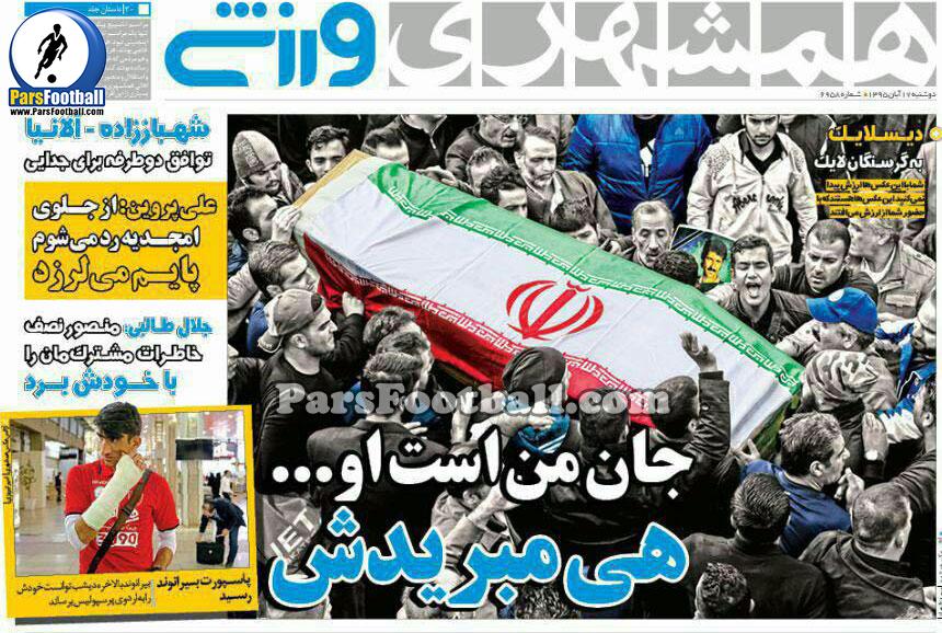 روزنامه همشهری ورزشی دوشنبه ۱۷ آبان ۹۵ ؛ جان من است او… هی مبریدش