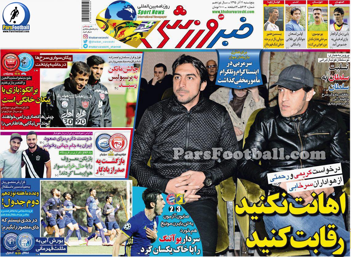 روزنامه خبر ورزشی پنجشنبه ۴ آذر ۹۵ ؛ درخواست کریمی و رحمتی از سرخابی ها ؛ سرمربی در اینستاگرام و تلگرام مأمور مخفی گذاشت