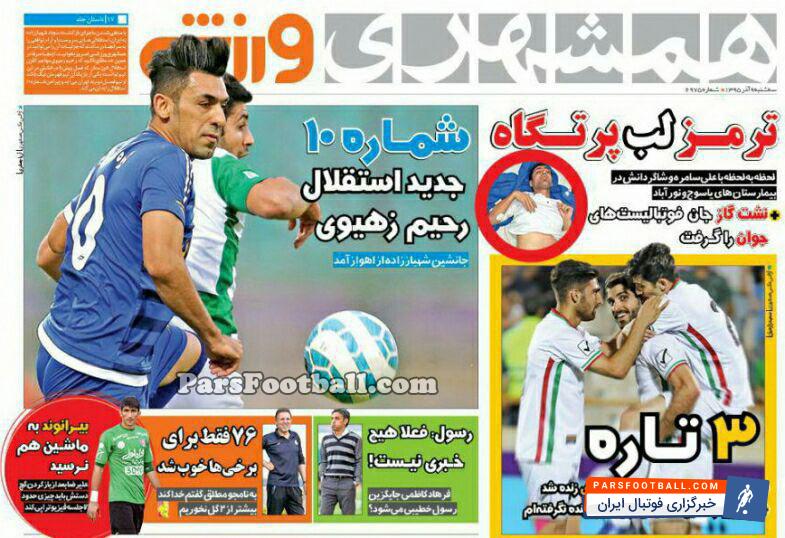روزنامه همشهری ورزشی سه شنبه ۹ آذر ۹۵ ؛ ترمز لب پرتگاه ؛ شماره ۱۰ جدید استقلال رحیم زهیوی