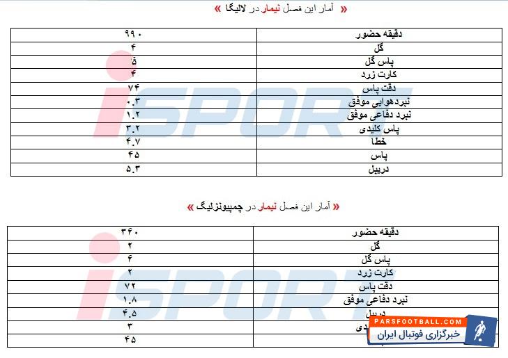 نیمار که شش گل زد و یازده پاس گل ارسال کرد. تعداد دریبلهای یکی از تکنیکیترین بازیکنان حال حاضر دنیا، به طور میانگین در هر دیدار لیگ عدد ۵.۳ است و در چمپوینزلیگ هم به طور میانگین در هر بازی ۴.۵ بار دریبل موفق دارد. بازیکن برزیلی بارسلونا معمولا در هر بازی یک بار هم نبردهوایی موفق دارد و ضربه سر اول را می زند. جالب است که مهاجم بارسا در هر بازی نزدیک به پنج بار مرتکب خطا می شود. آمار نیمار به عنوان بهترین بازیکن لالیگا را در جدول زیر مشاهده می کنید.