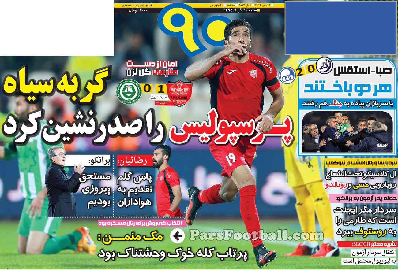 روزنامه نود شنبه ۱۳ آذر ۹۵ ؛ گربه سیاه پرسپولیس را صدرنشین کرد ؛ امان از دست طارمی گل نزن