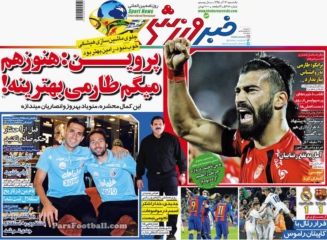 روزنامه خبر ورزشی یکشنبه ۱۴ آذر ۹۵ ؛ پروین : هنوز هم میگم طارمی بهترینه! ؛ برانکو : طارمی به روانشناس نیاز دارد