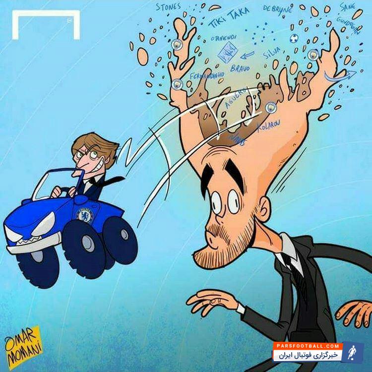 کاریکاتور عمر مومنی به مناسبت پیروزی دیشب کونته بر پپ گواردیولا