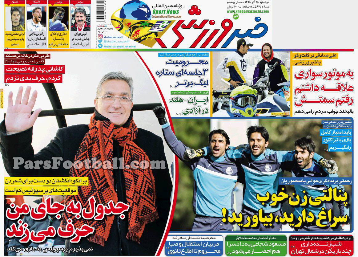 مروری داریم بر عناوین روزنامه خبر ورزشی دوشنبه ۱۵ آذر ۹۵ ؛ علی صادقی : به موتورسواری علاقه داشتم ، رفتم سمتش ؛ جدول به جای من حرف می زند ؛ رحمتی برنده کری خوانی با منصوریان
