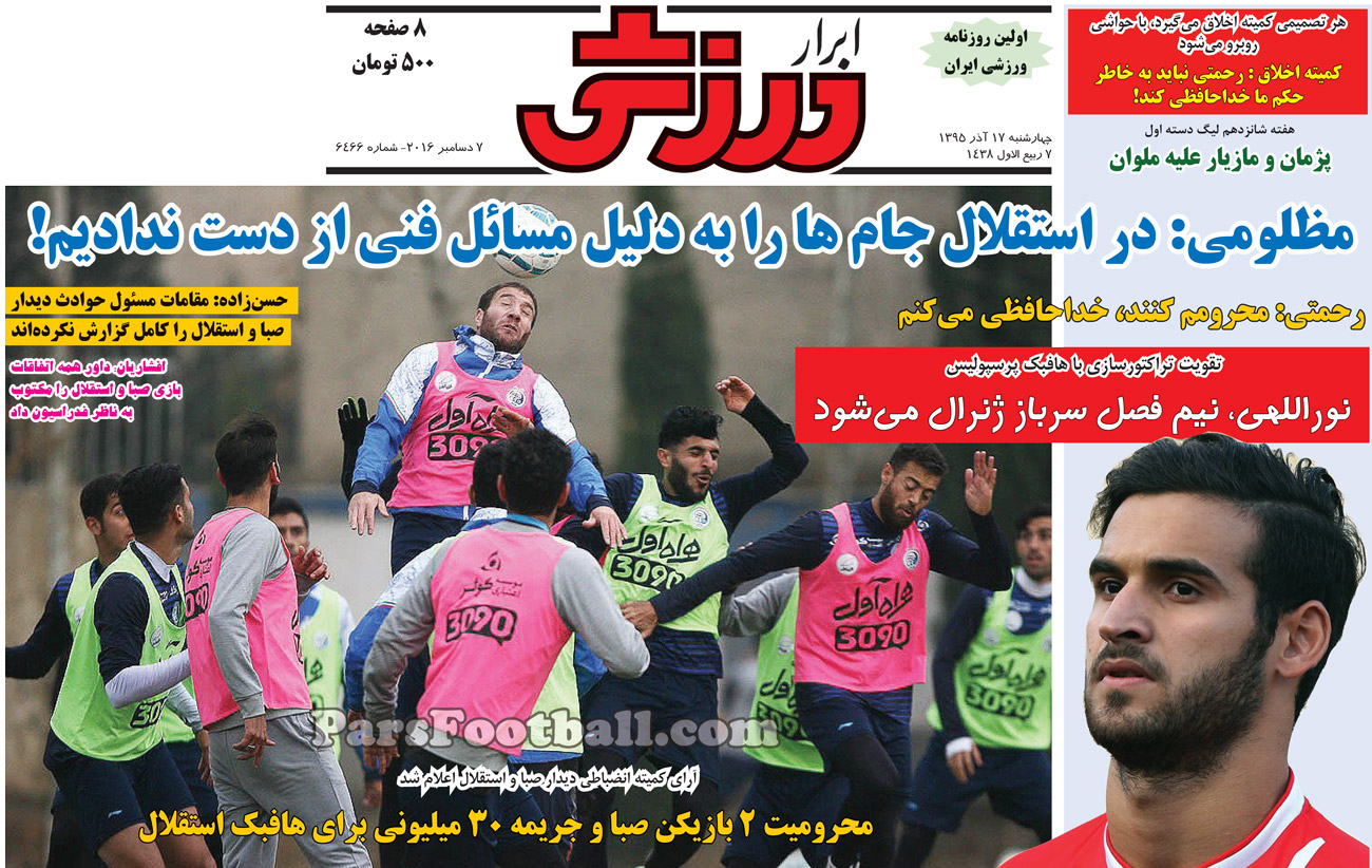 عناوین روزنامه ابرار ورزشی در روز چهارشنبه ۱۷ آذر به شرح زیر است :